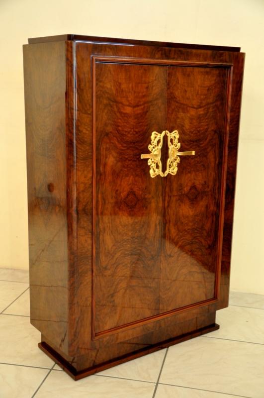 Exceptional pair of cabinets in veneer of burr walnut of America very beautiful gilded bronze, inside in oak , the one stocked with shelves and with golden bronze railings bar and the other one stocked with shelves.