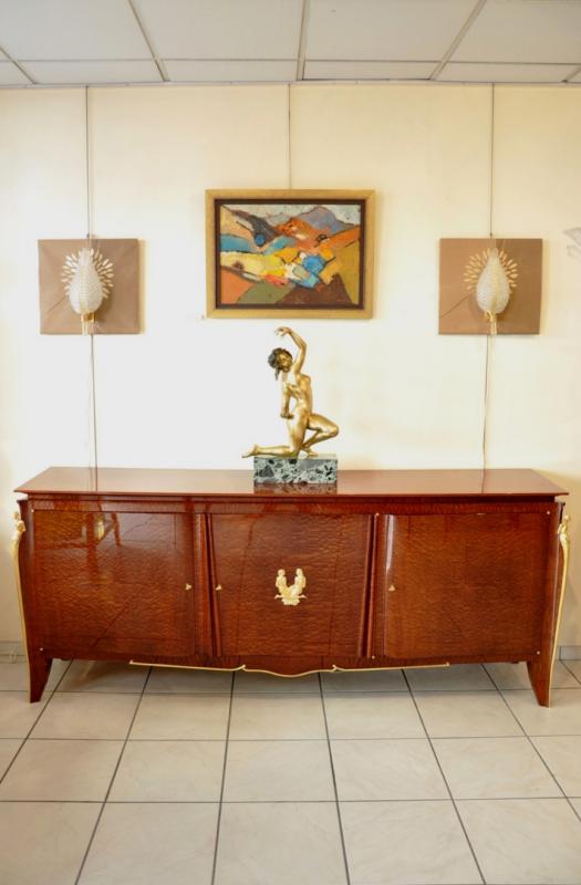 Exceptional sideboard in mahogany with 3 doors , exceptionnal ornamentation in gilded bronze by Léon Drivier french sculptor , inside in mahogany with 2 drawers circa 1940-1945