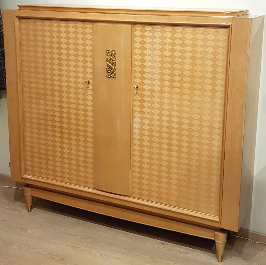 The cabinet is in ash veneer of thread & inlay with opposing threads of ash on the doors. It opens on the front with 2 doors, the interiors are in sycamore veneer and include 6 shelves and 8 compartments, the central frame is very slightly arched, the upper part is slightly recessed and is highlighted with a gilt bronze rod, the lower part, which is slightly recessed, is underlined by an ash molding, the 4 unhooked spinning-top feet end in gilded bronze shoes. The doors are highlighted with an ash molding.