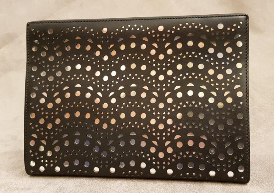 Black leather evening pouch cut with laser silver background , beige leather interior with ALAÏA Paris logo and mirror