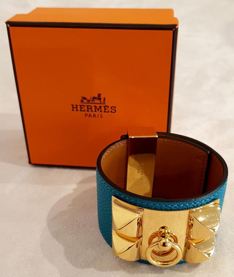 Gold-plated Médor cuff bracelet, blue-green epson leather size S, signed Hermès with its original box titled Hermès Paris