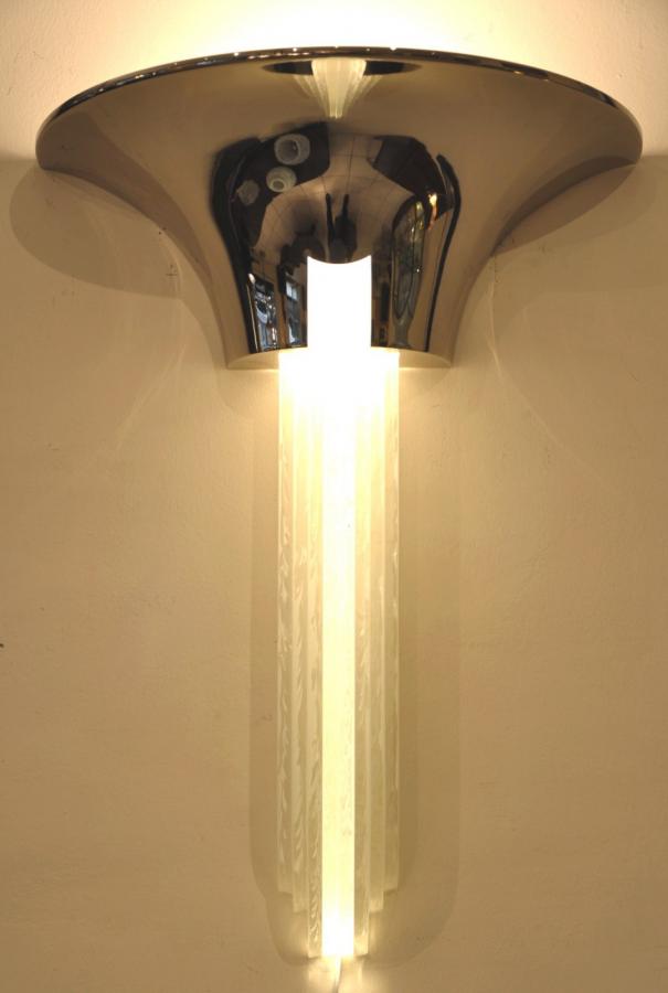 Rare et Spectaculaire Paire d'Appliques Grand Modèle N°651 du catalogue PERZEL en bronze chromé et verre sablé , lamelles en verre taillé à la main .