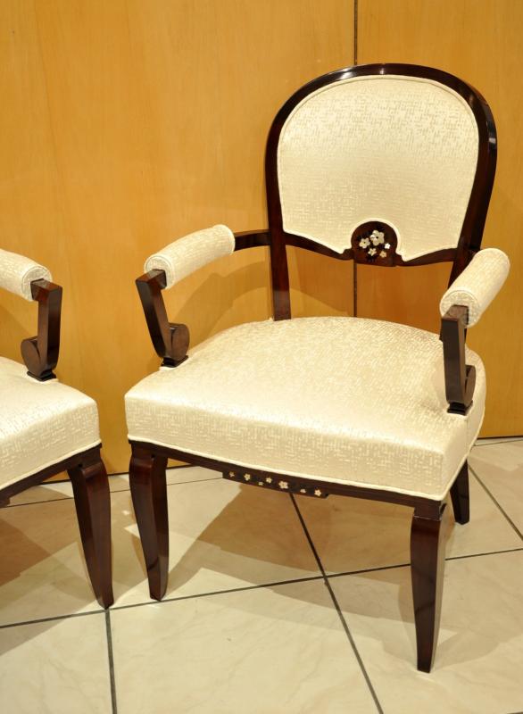 JULES LELEU PAIRE DE FAUTEUILS ACAJOU & MARQUETERIE 1948