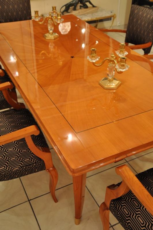 Salle à manger composée d'une table en merisier massif et marqueterie rayonnante de merisier , filet et étoile en ébène , sabot en bronze doré , et de 6 fauteuils en merisier massif circa 1940-1945.