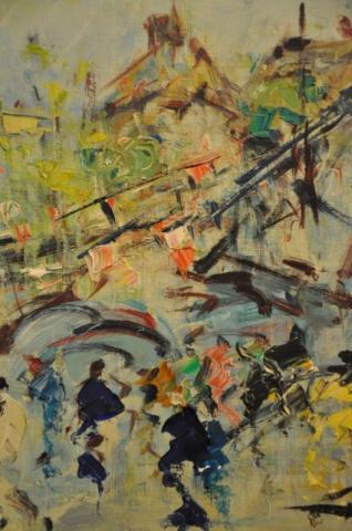 Huile sur toile datée de 1972 intitulée ' La fête des marins à Honfleur ' .