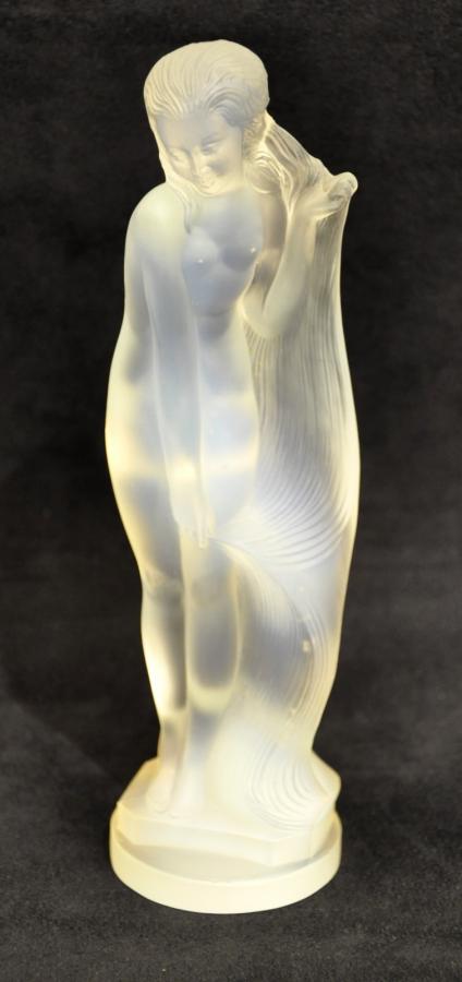 STATUETTE en VERRE OPALESCENT moulé pressé représentant une baigneuse.