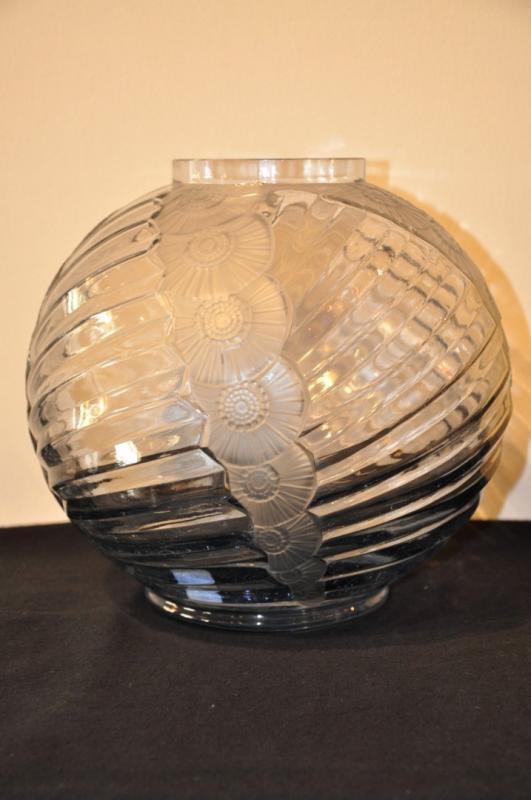 Rare et important vase en verre teinté bleu dans la masse moulé pressé d'époque ART DECO 1920-1925 signé en relief dans le décor SIMONET E.D et DIEUPART